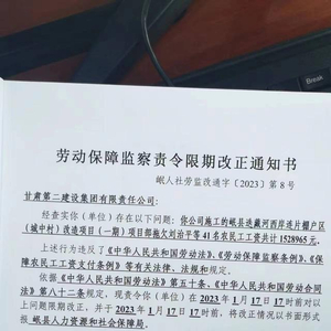 今年1月,刘治平等人向岷县人力资源和社会保障局劳动保障监察大队反映此事。同月14日,岷县人社局向甘肃第二建设集团有限责任公司(下称:甘肃二建)作出《劳动保障监察责令限期改正通知书》,要求甘肃二建限期将改正情况以书面形式报岷县人社局。