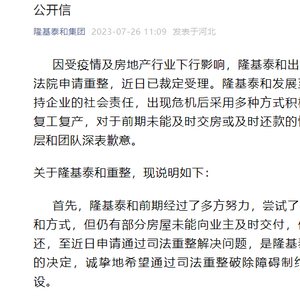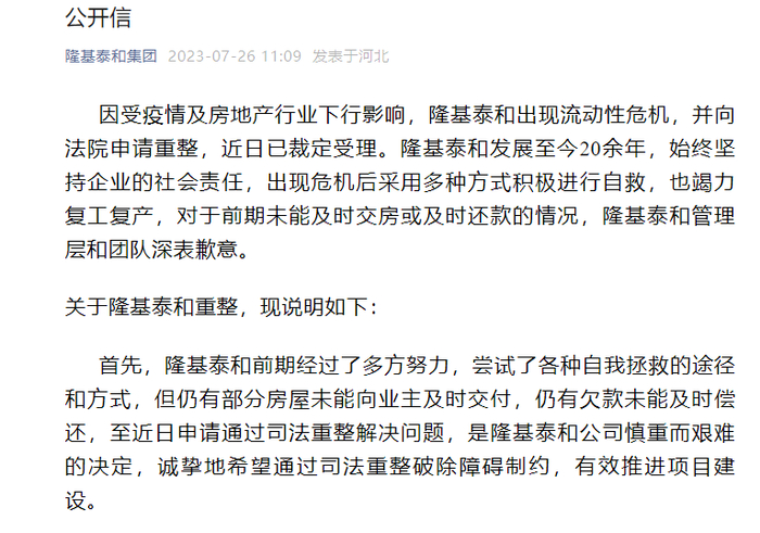 7月26日,知名房企隆基泰和在官微发布公开信,宣布已进入司法重整。