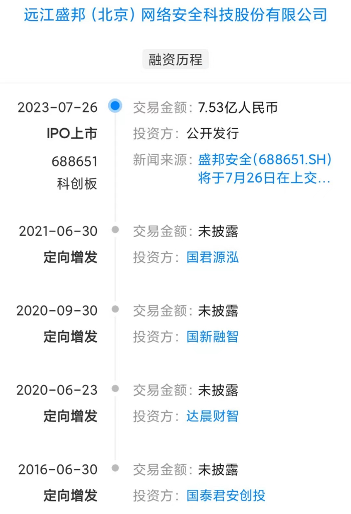 盛邦安全于7月26日获得国泰君安君享科创板盛邦安全1号战略配售集合资产管理计划、国泰君安证裕投资有限公司投资,投资金额为8256万元。