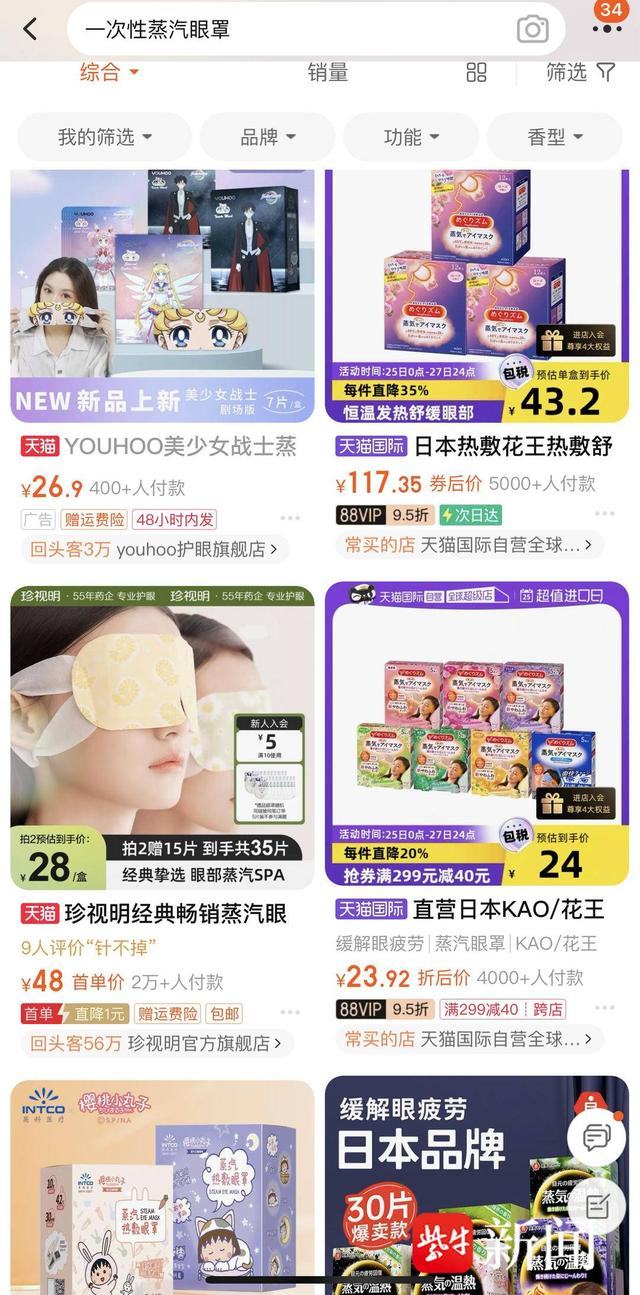 据统计,2022年一次性蒸汽眼罩的销售额近20亿元。记者在网购平台上搜索“一次性蒸汽眼罩”“一次性发热眼罩”后,琳琅满目的商品飞速跳了出来。进口品牌、国产品牌,卡通印花、中药成分、洋甘菊香味、薰衣草香味……各式各样类别的一次性蒸汽眼罩销售量都不错,价格在几毛钱到几元一片不等。