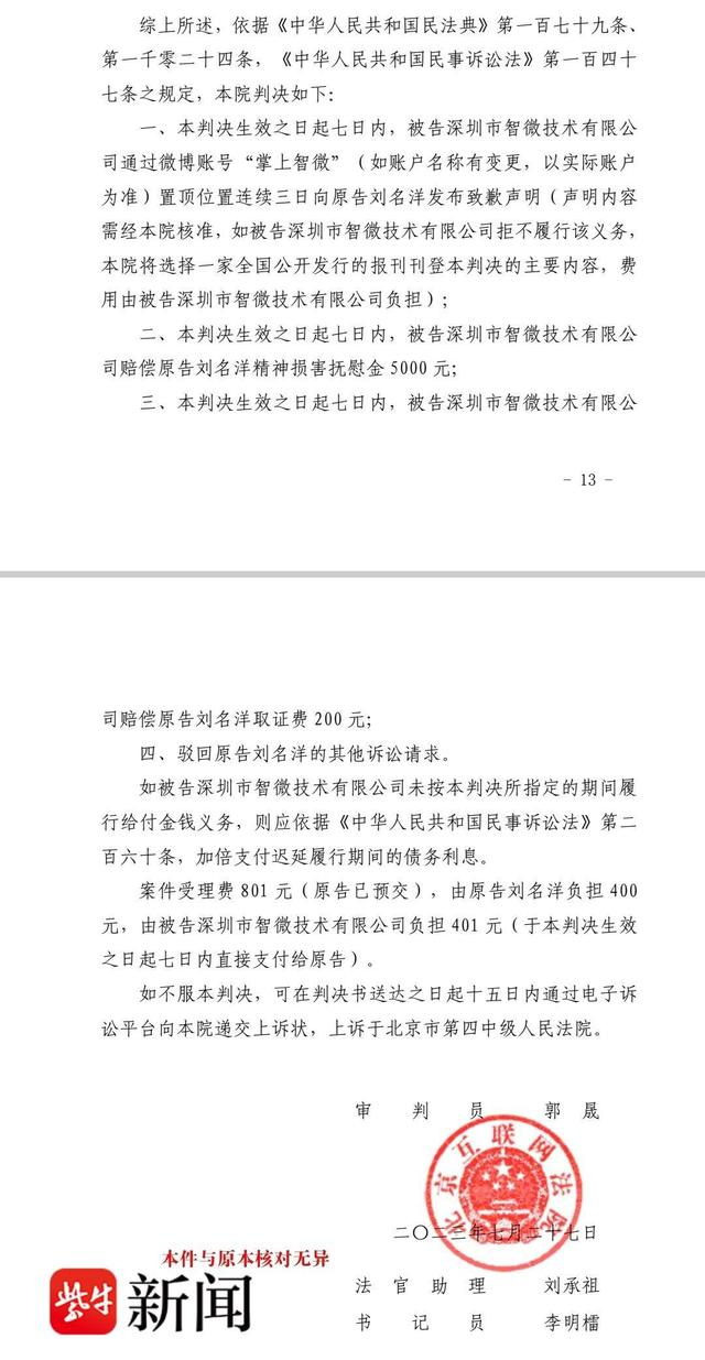 7月27日,前新京报记者刘名洋起诉微博自媒体“掌上智微”侵犯名誉权案件宣判,北京互联网法院认定被告“掌上智微”注册者深圳市智微技术有限公司(以下简称智微公司)构成对原告的侮辱、诽谤,侵害名誉权。智微公司需向刘名洋赔偿精神损害抚慰金5000元,取证费200元。