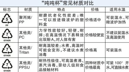 “吨吨杯”大多为塑料材质,消费者在选购时,一定要留意是否为食品级塑料。常见的塑料制品底下都会标注一个三角形图标及数字,三角形图标是塑料回收标志,连接头和尾的箭头表示可以回收。三角形中的数字(1—7)代表7种不同类型的塑料,目前消费者常用的“吨吨杯”或塑料水杯材质有PP材质(5号)、PC材质(7号)、Tritan材质(7号)、PPSU材质(7号)。