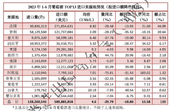 2023年1-6月,葡萄酒进口量为12826.05万升,进口额5.9亿美元,量额分别下跌29.8%和18.8%。无论是瓶装酒还是散装酒,量额均呈现两位数跌幅,且跌速明显。进口数据排名前13的葡萄酒原产国中,除了新西兰与南非逆势实现两位数以上的大幅度增长,进口葡萄酒市场表现极为消极。