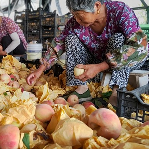 果农给每个水蜜桃称重。(李晔 摄)