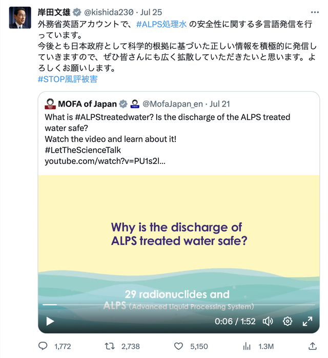 为了扭转所谓“风评被害”的现状,日本外务省近日表示,正在尝试利用人工智能等多种手段遏制有关福岛核污染水的相关谣言传播,并与美韩两国合作传播科学信息。7月25日,日本首相岸田文雄转发了外务省发布的一段有关核污染水安全性的英文视频,并添加了“STOP风评被害”的标签,呼吁大家广泛传播此帖。