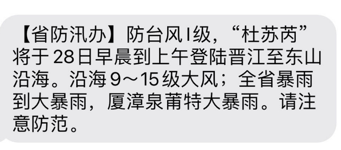 防台风1级,“杜苏芮将于28日早晨到上午登陆晋江至东山沿海。沿海9~15级大风;全省暴雨到大暴雨,厦漳泉莆特大暴雨。请注意防范。