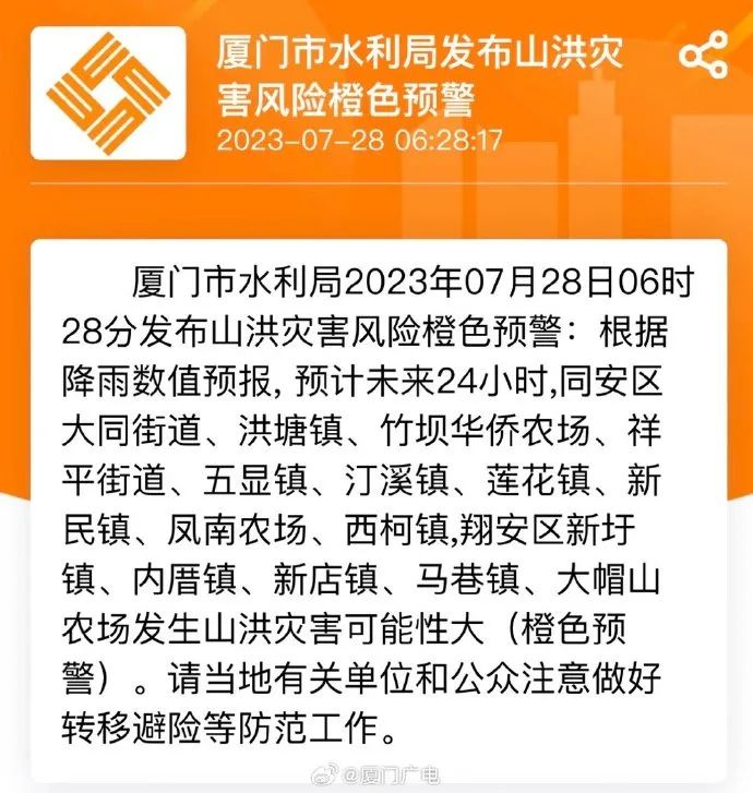 根据降雨数值预报, 预计未来24小时,同安区大同街道、洪塘镇、竹坝华侨农场、祥平街道、五显镇、汀溪镇、莲花镇、新民镇、凤南农场、西柯镇,翔安区新圩镇、内厝镇、新店镇、马巷镇、大帽山农场发生山洪灾害可能性大(橙色预警)。请当地有关单位和公众注意做好转移避险等防范工作。
