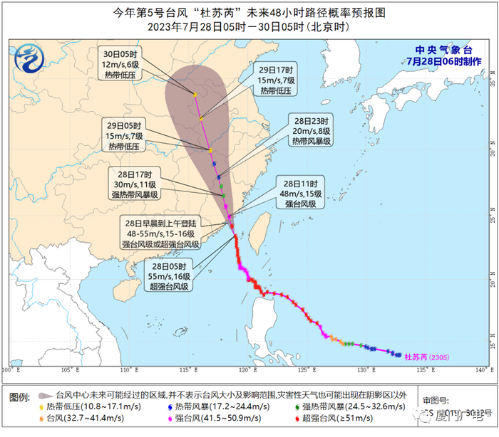 预计,“杜苏芮”将以每小时25-30公里的速度向北偏西方向移动,强度变化不大,将于28日上午在福建厦门到惠安一带沿海登陆(强台风级或超强台风级,48-55米/秒,15-16级)。