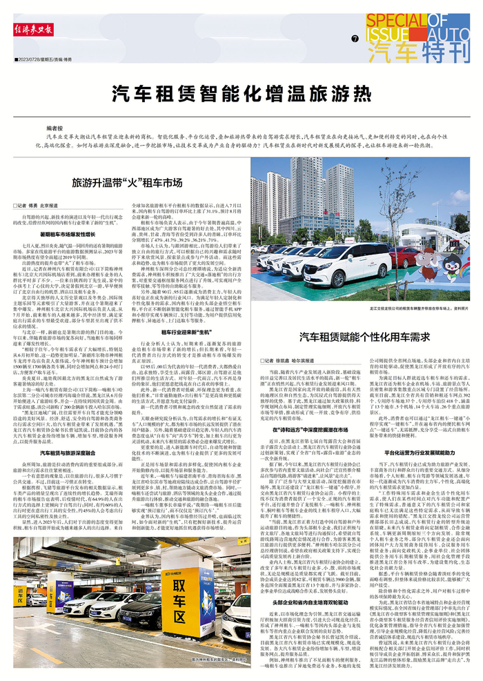 “黑龙江地域广阔,往往需要开车自驾才能充分领略沿途的美好风景。经济、舒适、安全的自驾游和各类商务出行需求空间巨大,给汽车租赁业带来了发展机遇。”黑龙江省汽车租赁协会秘书长曾冠凯说,目前协会内的各大汽车租赁企业纷纷增加车辆、增加车型,增设服务网点,以提升服务品质。