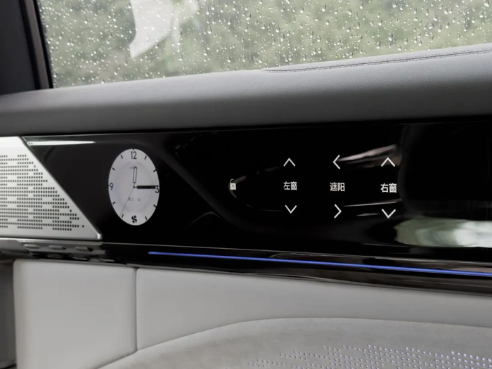 长达2.4m的顶棚氛围灯,与双侧滑移门饰板的70颗LED氛围灯可实现光影律动效果。此外,车窗与遮阳帘均采用触控操作,前方的圆形显示屏在常规状态下为时钟界面,划动可切换至空调控制面板。不过在二排座椅调至最后时,距离乘客位置会比较远。