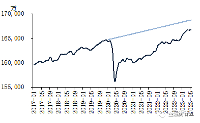 由于劳动力市场需求趋于下行,劳动者主动离职的意愿下降,主动离职人数显著下降,从2022年月450万的历史回落至2023年4月的379万,辞职率相应地从历史高位的3%回落至2.4%。