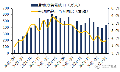 4.劳动力供需缺口收窄,薪资增速放缓。由于劳动力供给复苏提速,而需求端出现放缓,加之供需匹配效率的提升,美国劳动力市场供需出现改善。若以“工作岗位数量(就业人数与职位空缺数之和)”与“可使用工人数量(劳动力规模)”差值衡量美国劳动力供需缺口,并考虑季节性因素,4月的缺口约为444.6万,较2022年3月创下的605.4万峰值收窄超过四分之一,但仍远高于疫情前2019年116万的均值水平。供需缺口收窄,供需紧张局面有所缓解,薪资增速随之放缓,2022年3月的5.9%回落至4月的4.3%。