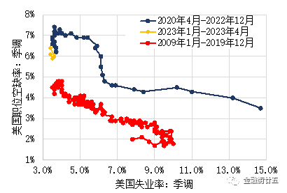 3.劳动力供需匹配效率提升。新冠疫情后,由于工作方式的改变、跨部门及跨地区难度提升,加大了劳动力市场的摩擦,导致供需匹配效率的下降,体现在贝弗里奇曲线的右移。进入2023年以来,美国的贝弗里奇曲线出现左移的趋势,供需匹配效率有所提升。
