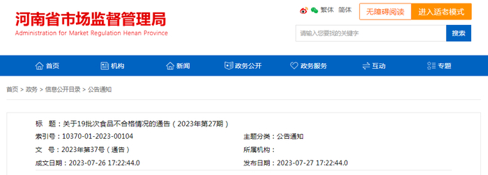 河南省市场监管局关于19批次食品不合格情况的通告(2023年第27期)2023年第37号