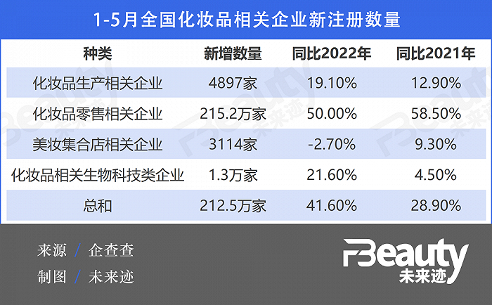 据企查查数据,2023年1月至5月,我国累计新注册212.5万家化妆品相关企业,同比增加41.6%,相比2021年同期增加28.9%。其中化妆品生产相关企业4897家,化妆品零售相关企业215.2万家,美妆集合店相关企业3114家。