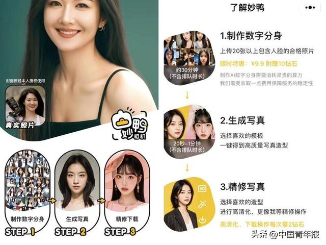 “我觉得很不错,虽然是风格模板,但更像我,如果不告诉他人,还以为我新拍了艺术照。”在某热门证件照拍摄机构消费过数次的陈女士觉得,妙鸭的成像效果已经超过了部分机构,“那些机构也是模板拍摄,背景、妆容都是统一的,单次价格至少几十元,只有几张照片,而且并不完全让人满意。”她举例,自己是圆脸,却被机构的修图师流水线作业修成了尖脸;她脖子较长,不适合V字领服装,但在某些风格照中,只能选择V字领。