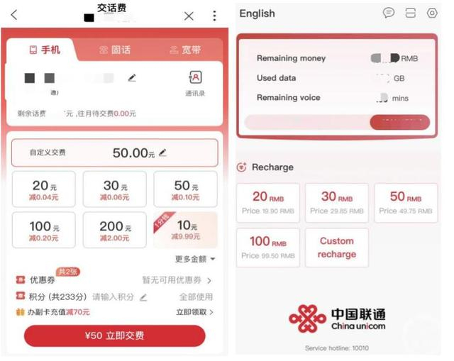 近日,重庆市民张女士(化名)无意中发现,把中国联通APP切换成英文版后,充值话费更便宜了。她告诉上游新闻记者:同样充值人民币50元,中文版优惠0.1元而英文版优惠0.25元,便宜一半多,这是为什么?”