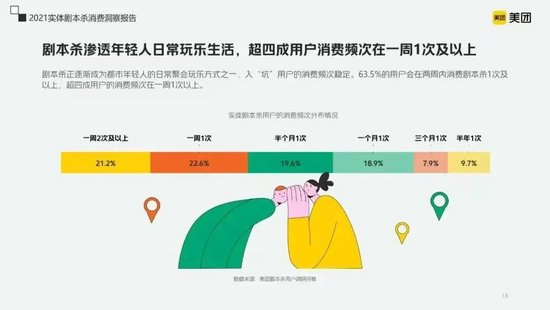 另据美团发布《2021实体剧本杀消费洞察报告》显示,我国剧本杀消费者人数达到近千万人,其中超七成为30岁以下的年轻人群。63.4%的用户会在两周内消费剧本杀1次及以上,超四成用户的消费频次在一周1次以上,有些老玩家还会选择一天连续玩两场。
