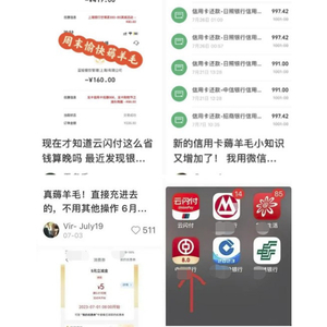 “整理了近期部分银行APP的‘羊毛’,新用户注册领券有外卖红包,电影票满30元减10元,美食周三五折。”“总结银行APP日常‘羊毛’,每天投入不到3分钟,一年能有500元+。”
