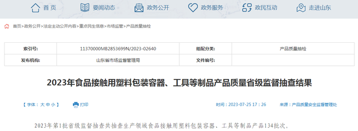 山东省市场监管局抽查食品接触用塑料包装容器、工具等制品产品134批次 全部合格