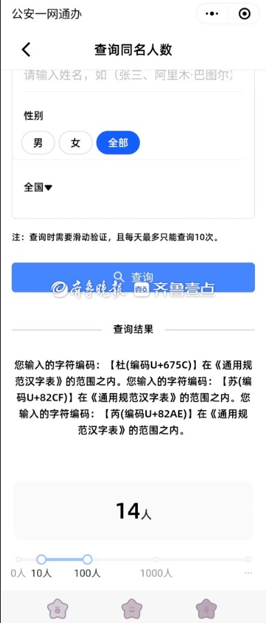 记者在小程序“公安一网通办”平台查询发现,全国共有14人同名“杜苏芮”,其中女性就有12人,占比最多。