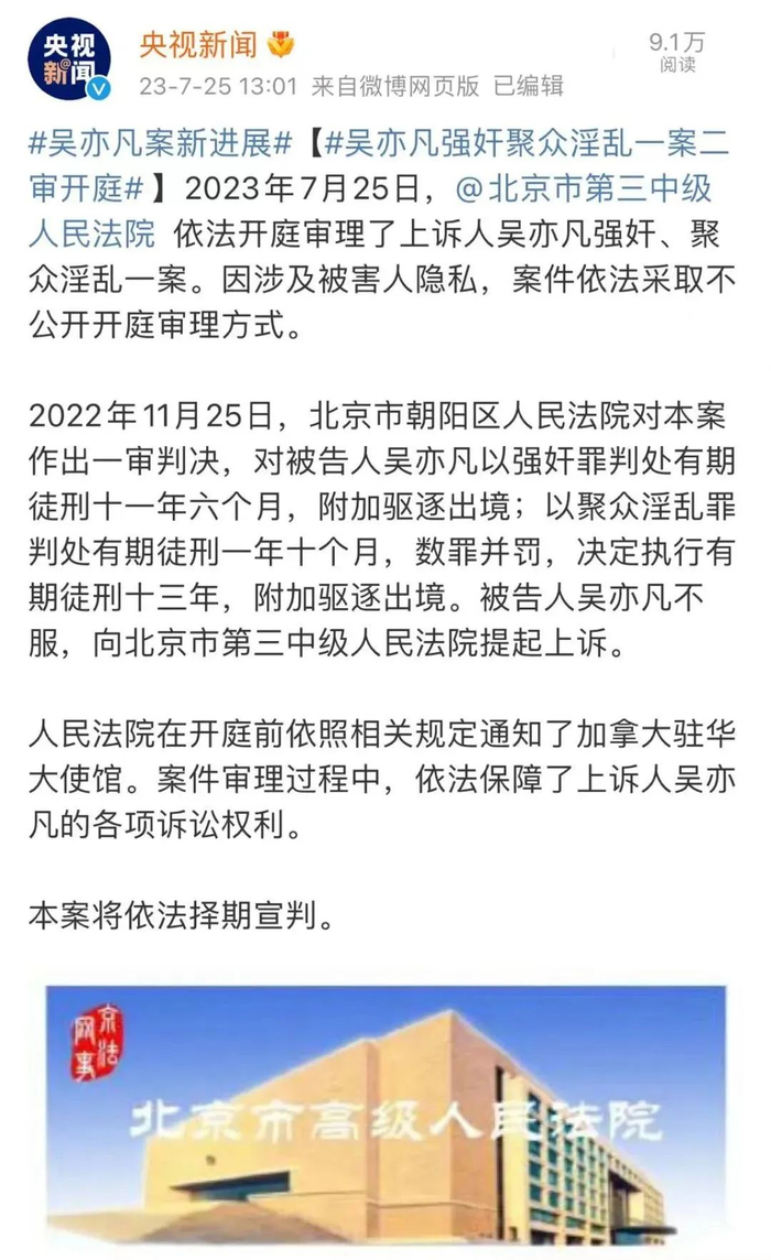 上诉人吴亦凡强奸、聚众淫乱一案。