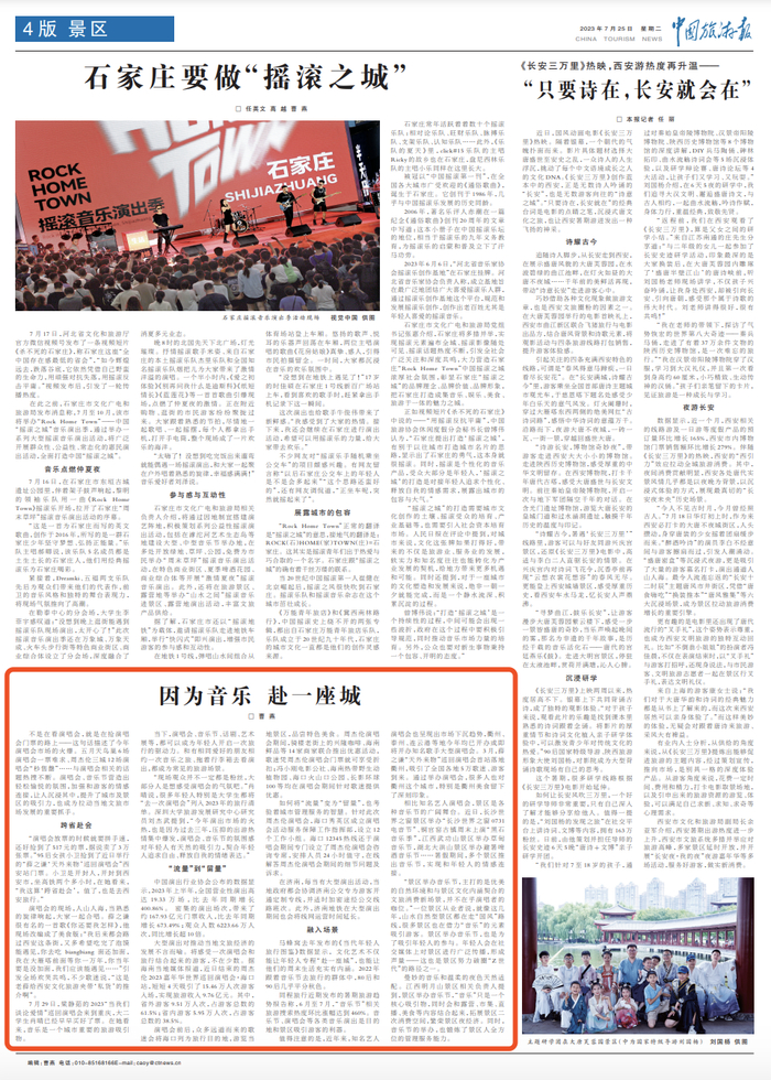 不是在看演唱会,就是在抢演唱会门票的路上——这句话描述了今年演唱会市场的火爆。五月天鸟巢6场演唱会一票难求、周杰伦三城12场演唱会“秒售罄”……与演唱会相关的话题热搜不断。演唱会、音乐节营造出轻松愉悦的氛围,加强和游客的情感连接,让人沉浸其中,提升了城市及景区的吸引力,也成为拉动当地文旅市场发展的重要抓手。