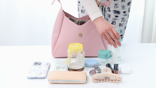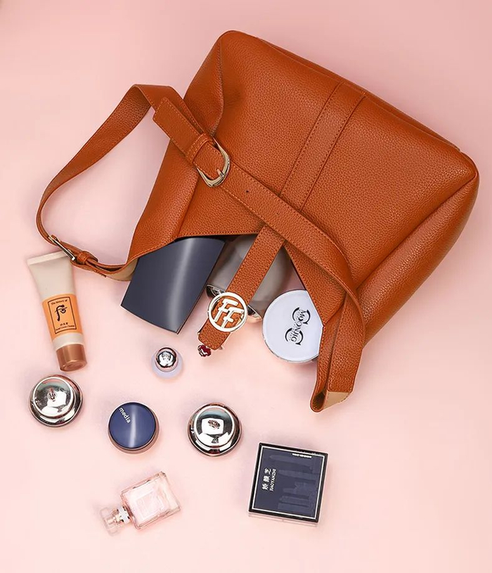 我们装了:牙膏大小的乳液、面霜、水壶、吸油纸、散粉、镜子、口红、耳机、指甲钳套盒、发夹、手机