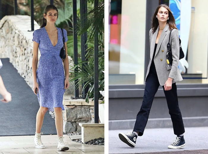 腋下包不仅能解放双手,更能拉高身体重心,显得人比例更好。瞧瞧Kaia从肚脐就开叉的腿,背起腋下包更是锦上添花。