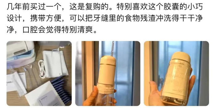 我还采访了CC同学,她说:“医生推荐用,后面用着用着就戒不掉了,本来戴牙箍就容易卡食物,以前刷牙刷半天,现在每天冲牙器1分钟搞定,贼爽~”