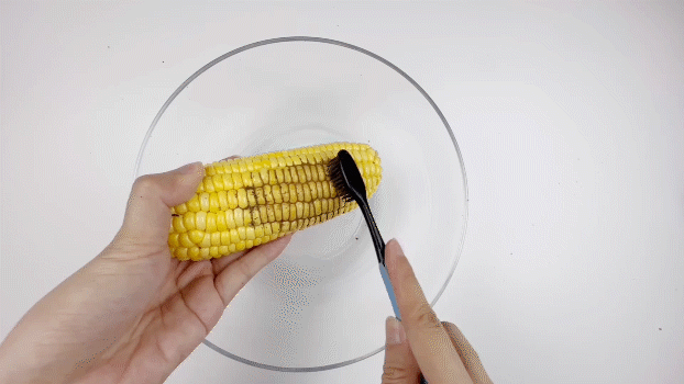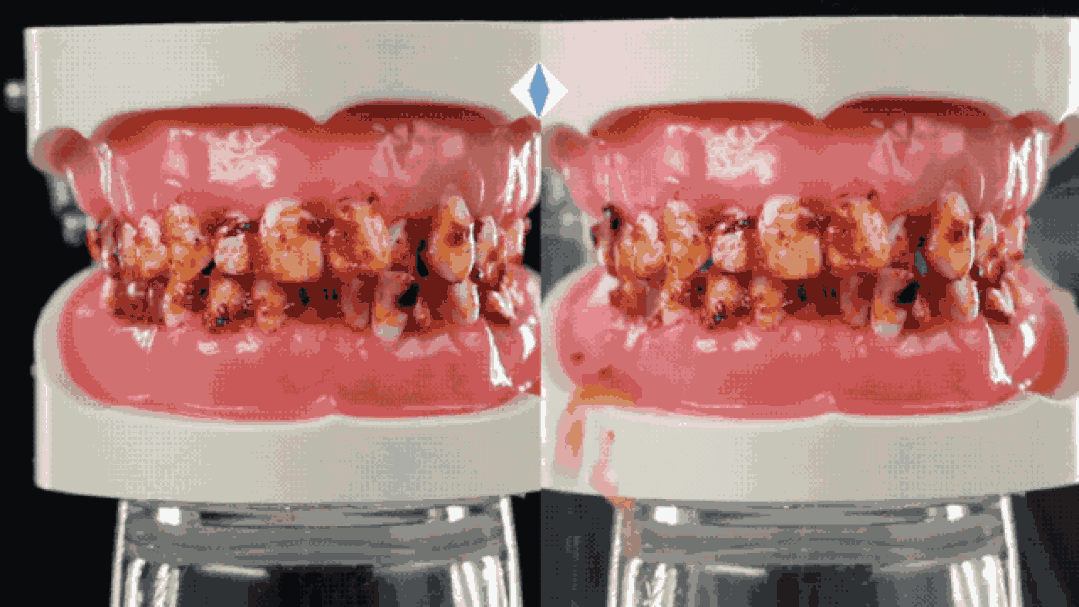 用玉米缝模仿人体牙齿,塞满黑乎乎的芝麻碎,你看刷牙后及时水冲也依然有很多黑垢残留。