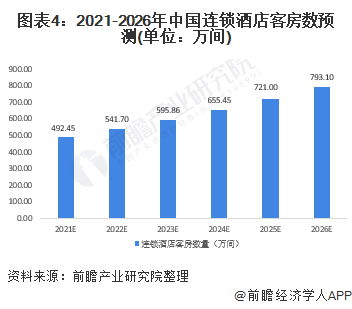 前瞻产业研究院预测,2022-2026年连锁酒店客房数将恢复较高速增长态势,但增速相比2016-2020年有所放缓,保守估计年度增速在10%,主要是由于未来行业逐渐趋向成熟。至2026年中国连锁酒店客房规模将达到793.1万间,酒店连锁化水平将大大提高,预计将超过50%。