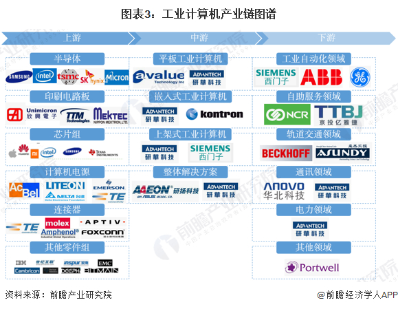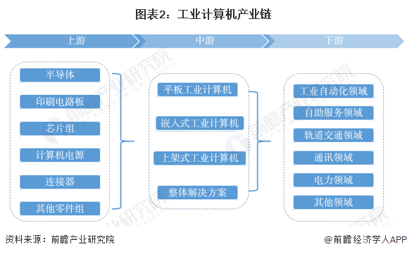 工业计算机的客户虽然都是机构或者组织单位,但其上游行业结构几乎和个人电脑行业是一致的,工业计算机上游包括半导体、印制电路板、晶片组、电源等各种原材料和相关零部件;中游则包括单板电脑、输出入设备、准系统产品和相关IPC产品等;行业下游则包括各不同细分领域的系统整合商和加值经销商,如工业自动化领域工业计算机应用等。
