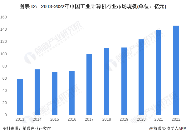 根据中国工控网统计数据显示,2013-2015年,为我国工业计算机行业市场规模呈现波动趋势,2015-2022年,我国工业计算机市场规模则呈现逐年上升趋势,2022年工业计算机市场规模达到约146亿元,年复合增速约为10.6%。