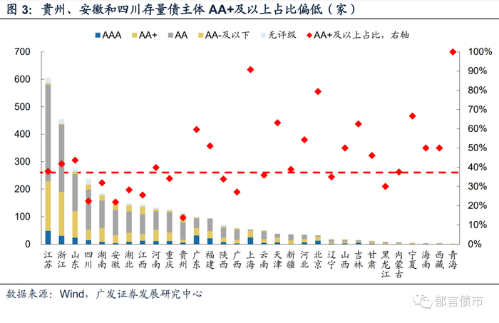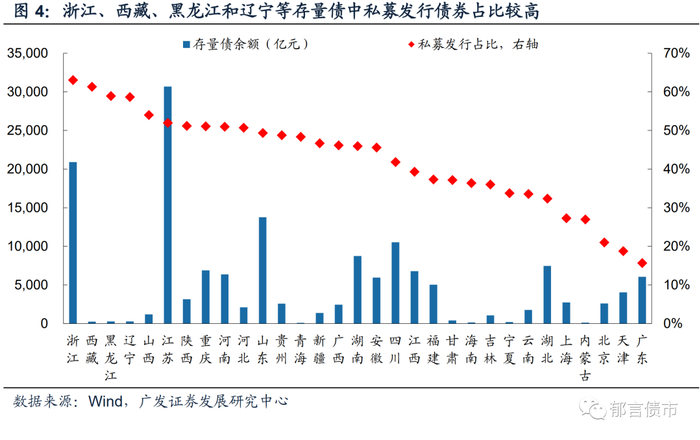 存量债分省份看,江苏、浙江存量债规模位居全国前列,均在2万亿元以上。而青海、内蒙古、海南存量债规模较小,均在150亿元以下。从私募发行存量城投债占比来看,浙江排第一,占比为63.1%;西藏、黑龙江、辽宁、山西、江苏、陕西、重庆、河南和河北占比超过一半。而天津和广东私募发行存量城投债占比较小,在20%以下。