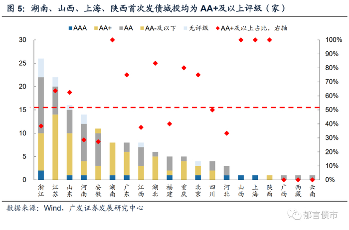首次发债城投平台主要分布在全国20个省份。其中浙江首次发债城投数量居全国第一,为26家;江苏次之,为22家;而后是山东、河南、安徽,首次发债城投数量在10-20家之间;其余省份首次发债主体数量均未超过10家。湖南、山西、上海、陕西首次发债主体评级均为AA+及以上,而广西、西藏、云南首次发债主体评级均为AA。