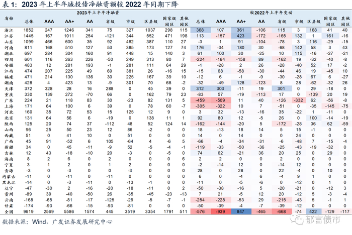 2023年上半年城投债净融资0.96万亿元,较2022年同期下降576亿元。其中,AAA级和省级平台净融资下降更多,AAA城投平台净融资下降939亿元,省级平台下降668亿元。