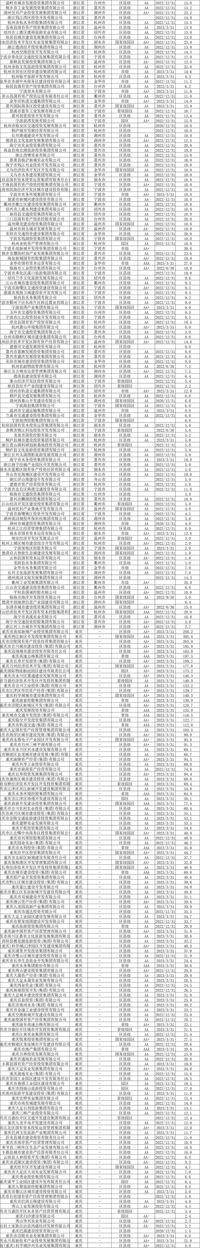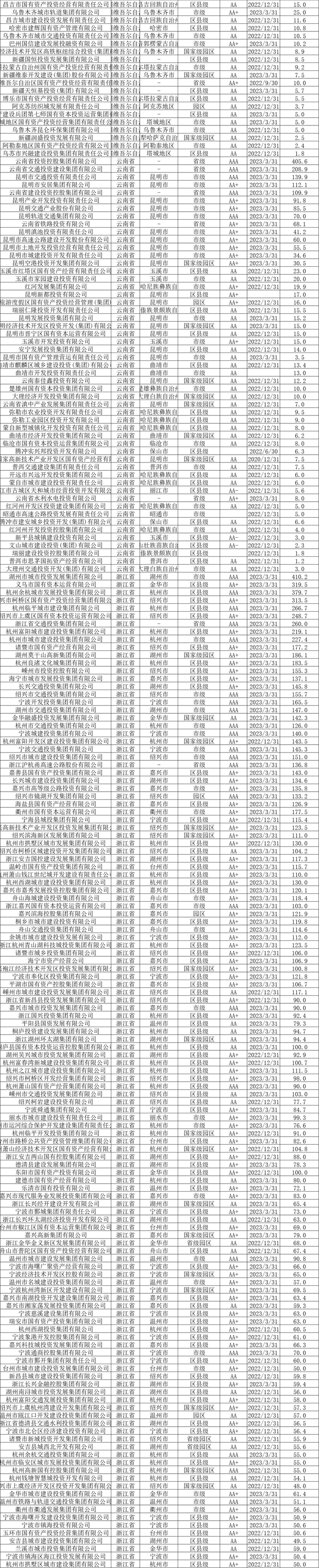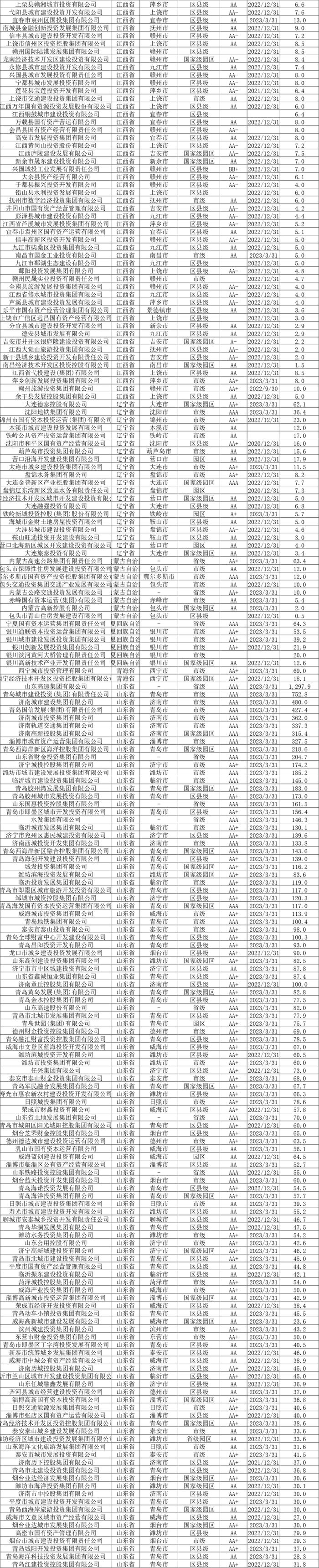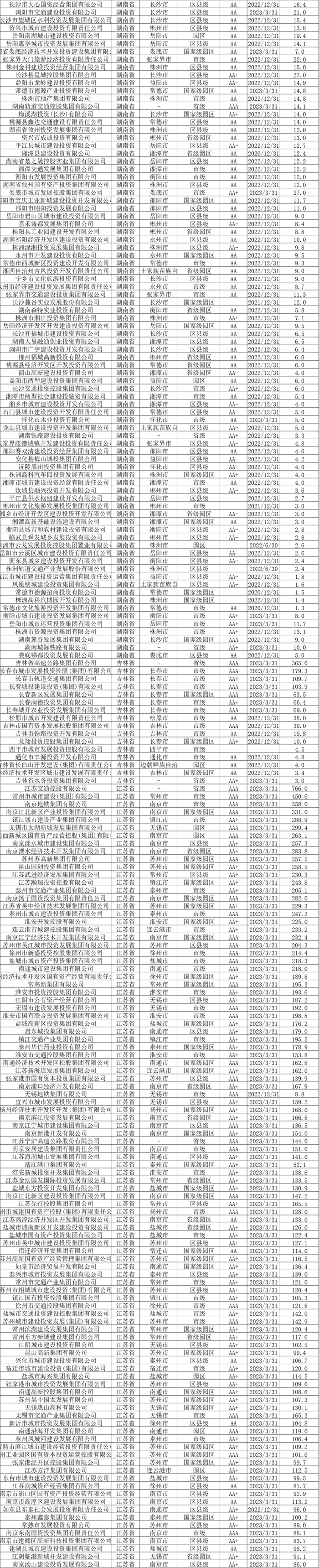 截至2023年6月末,全国发债城投平台共有3252家,较2022年末增加87家。其中,辽宁交通投资有限责任公司、北京公共交通控股(集团)有限公司、江西公路开发有限责任公司、江苏省沿海开发集团有限公司、天津市政投资有限公司、吉林市城市建设控股集团有限公司等,存续债券全部到期的70家平台被移出名单。