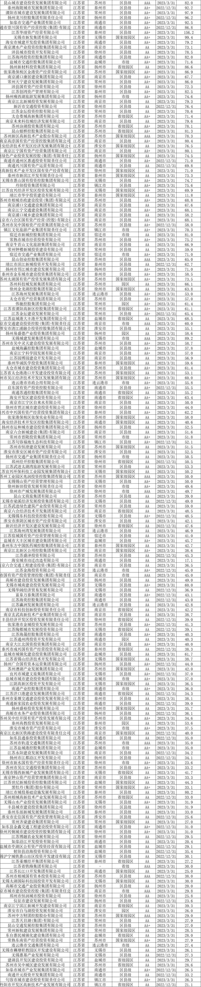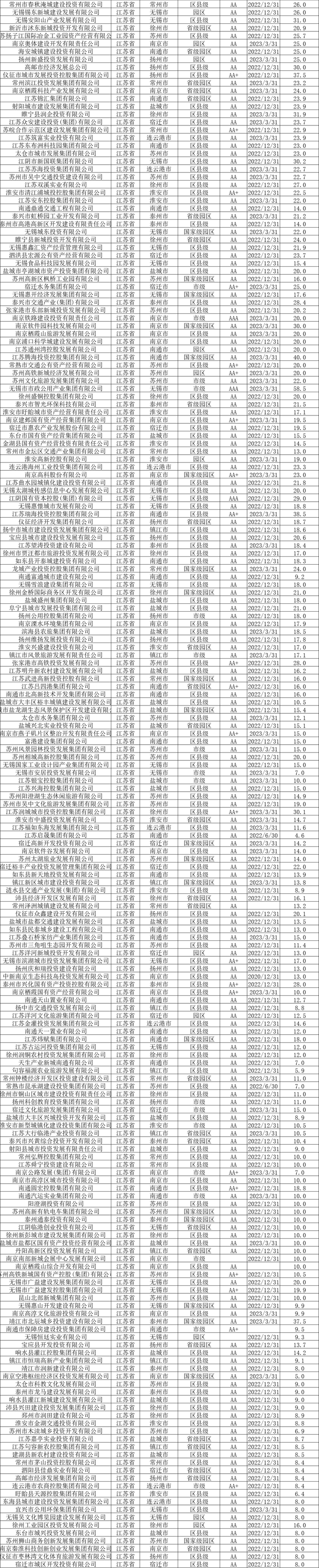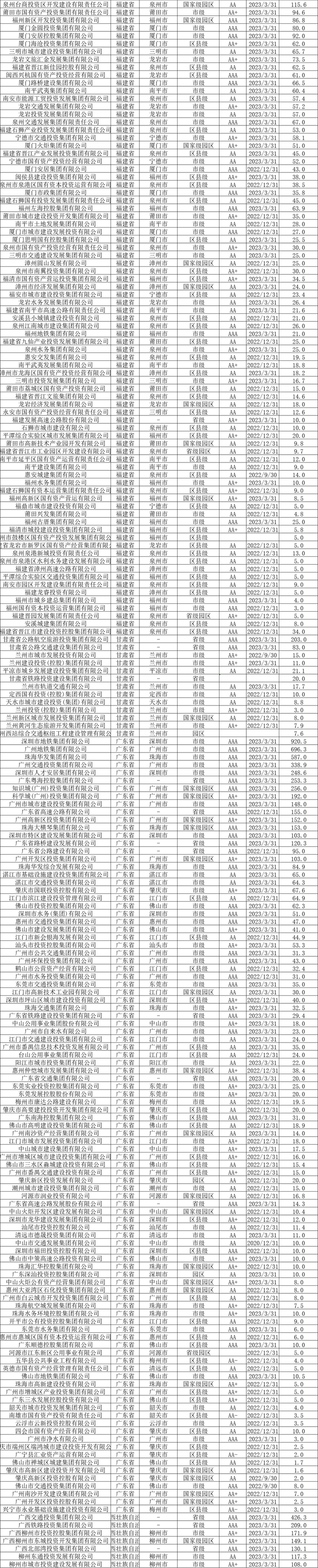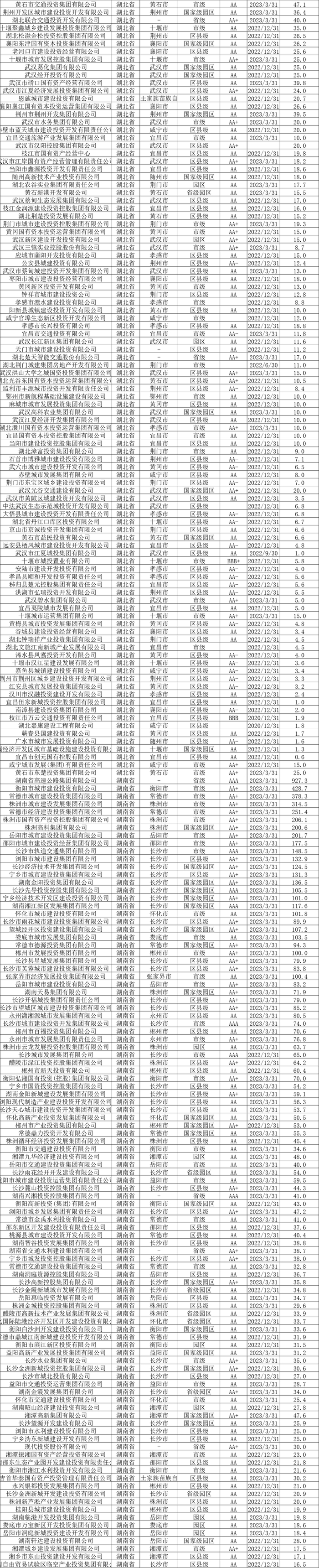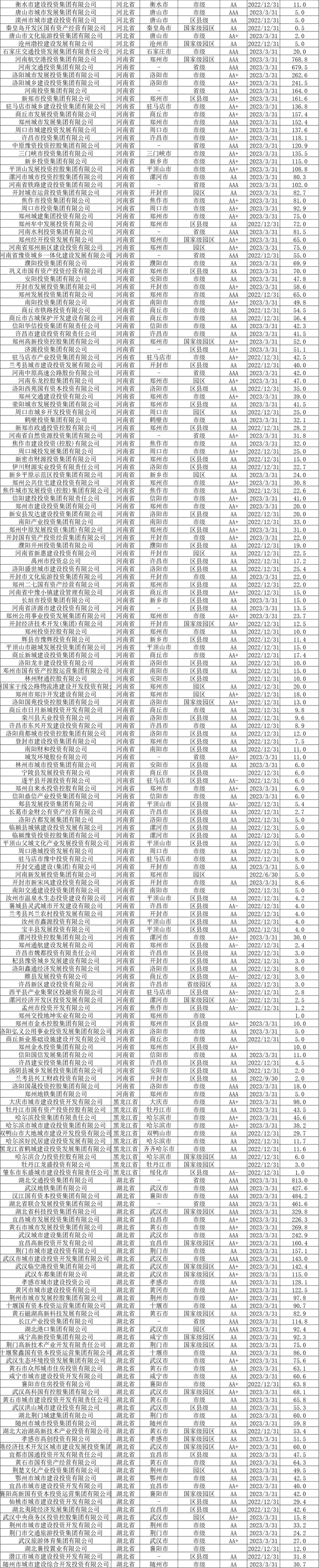 截至2023年6月末,全国发债城投平台共有3252家,较2022年末增加87家。其中,辽宁交通投资有限责任公司、北京公共交通控股(集团)有限公司、江西公路开发有限责任公司、江苏省沿海开发集团有限公司、天津市政投资有限公司、吉林市城市建设控股集团有限公司等,存续债券全部到期的70家平台被移出名单。