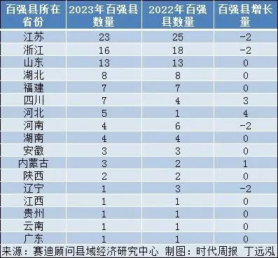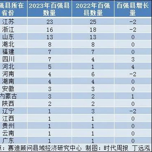 具体而言,江苏、浙江、河南、辽宁4个省份的百强县数量各减少2个,河北、四川、内蒙古的数量均有所增加。