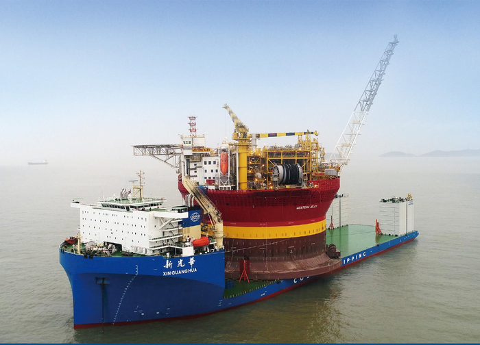 据介绍,半潜船是一种能“潜水”的运输船,又称“海上叉车”,它可以像陆地上的叉车一样,通过自身压载水的调整,把甲板潜入水中,将承运货物从指定位置上浮托举完成装载。半潜船主要用于运输无法分割吊装的超大型装备,如海洋工程平台、油气开采模块、大型风电装备、丧失动力的舰船等。由于半潜船专门用于海上重大件运输及安装,因此有“大国重器”之称。合资公司运营的最大半潜船“新光华”轮,全长255米,型宽68米,下潜吃水30.5米,甲板面积相当于两个标准足球场大小,是亚洲最大、全球最先进的10万吨级半潜船。