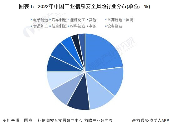 中国工业信息安全风险行业分布来看,电力、制造业、交通、石油石化、烟草、水利等行业工业信息安全风险较高,工业信息安全投入继续保持平稳的态势,其中,电力、石油石化行业为工业信息安全投入位列前二。根据国家工业信息安全发展研究中心的数据,2022年,电子制造业遭受勒索攻击风险事件占比高达23%。