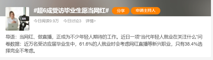最近,微博发布了一项“当代年轻人就业在关注什么”问卷数据:近万名受访应届毕业生中,61.6%的人就业时会考虑网红直播等新兴职业,只有38.4%选择完全不考虑。