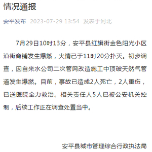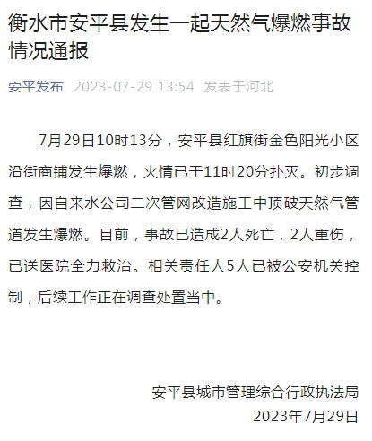 河北省衡水市安平县城市管理综合行政执法局29日通报:7月29日10时13分,安平县红旗街金色阳光小区沿街商铺发生爆燃,火情已于11时20分扑灭。初步调查,因自来水公司二次管网改造施工中顶破天然气管道发生爆燃。目前,事故已造成2人死亡,2人重伤,已送医院全力救治。相关责任人5人已被公安机关控制,后续工作正在调查处置当中。
