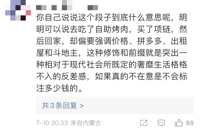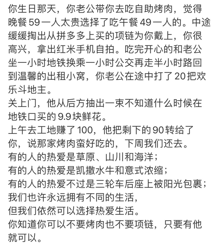 为什么要特意强调49元的自助烤肉、拼XX上买的项链、红米手机、坐地铁转公交回家、住出租屋?