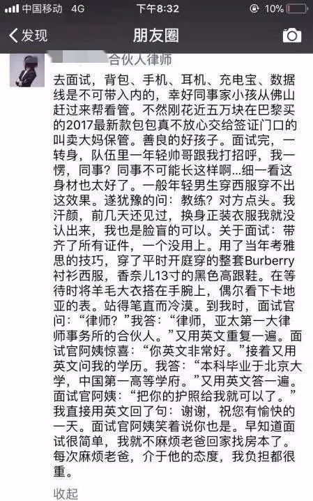 还有之前闹得沸沸扬扬的“北京炫富女律师”事件,一家知名律所的年轻女合伙人,经常在朋友圈和微博上发表这样的言论: