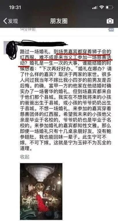 去参加一次别人的婚礼,尖酸刻薄地嘲笑男方穿的是狮子会的红西服,看不起小县城出身的人: