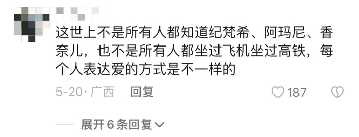 “这世上不是所有人都知道纪梵希、阿玛尼、香奈儿,也不是所有人都坐过飞机坐过高铁,每个人表达爱的方式是不一样的。”