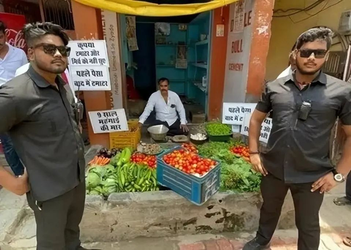 印度一家蔬果店的老板因担心顾客为抢西红柿或暴力杀价,而雇用两名保镖看店
