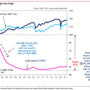 到2005年,日本六个主要城市的物业平均价格下跌了87%。在这个过程中,国家损失的财富总额达到了1,500万亿日元,约相当于1989年国内生产总值的三倍。
